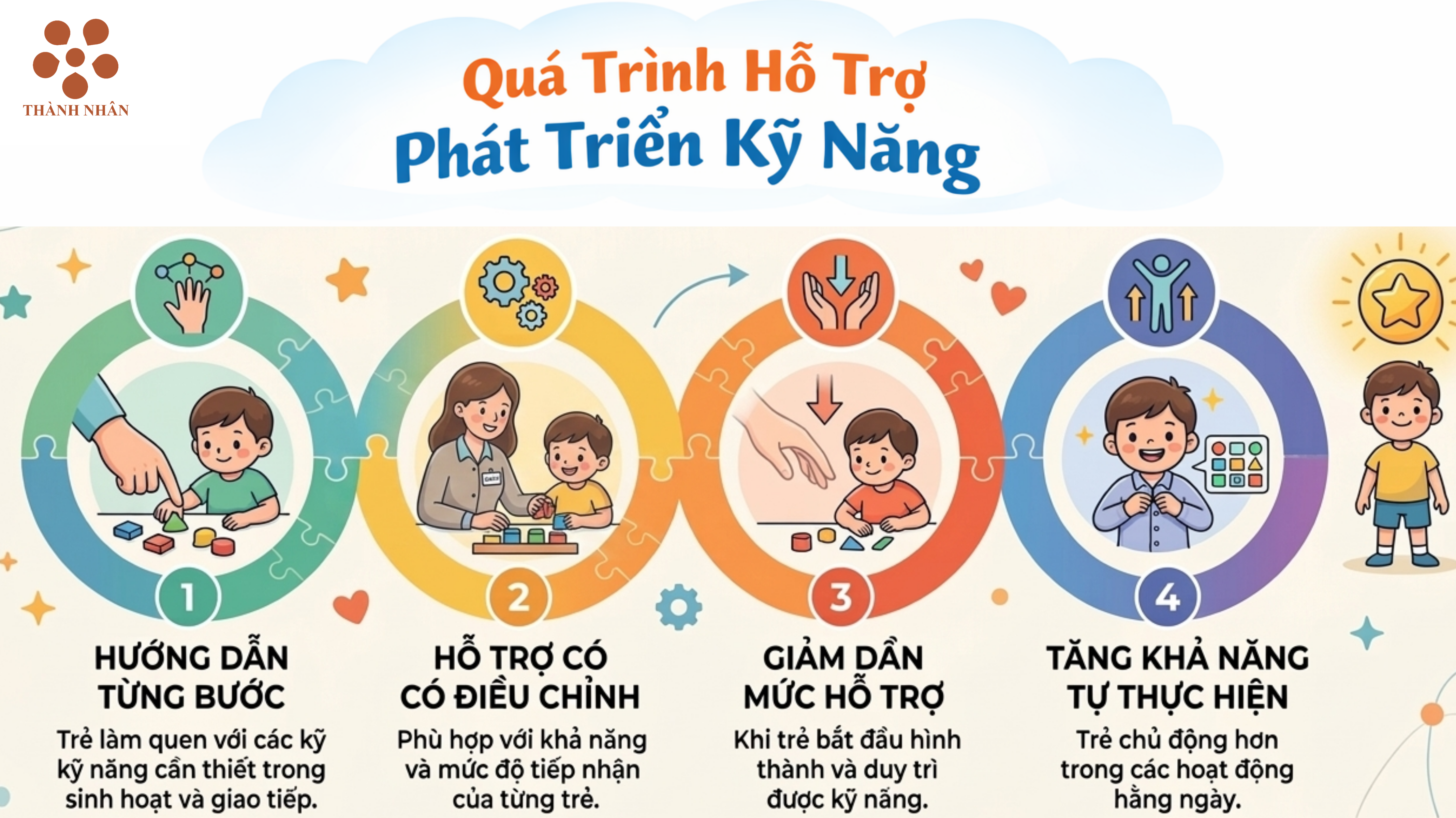 Tại Cơ sở trợ giúp xã hội Thành Nhân, các hoạt động được tổ chức nhằm trợ giúp và đồng hành cùng trẻ em có nhu cầu hỗ trợ đặc biệt, giúp trẻ từng bước hình thành và phát triển các kỹ năng cần thiết trong cuộc sống. Mục tiêu của quá trình hỗ trợ là tăng khả năng tự thực hiện các hoạt động cá nhân, nâng cao khả năng thích ứng và hướng tới sự tự lập phù hợp với khả năng của mỗi trẻ.
